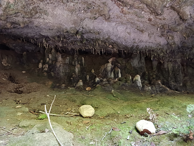 Αφού σκαρφαλώσουμε, με αρκετή δυσκολία είναι η αλήθεια, τα βράχια στην αρχή του σπηλαίου, προχωράμε στο εσωτερικό. Τα ανοίγματα της οροφής φαίνονται πολύ πιο επιβλητικά. Δεξιά, πάνω σε ένα βράχο, ένας πολύ εντυπωσιακός σχηματισμός από σταλακτίτες τραβά την προσοχή μας. Φτάνουμε στην έξοδο του σπηλαίου, που είναι πολύ πιό μικρή από την είσοδο. Το περνά μέσα από το σπήλαιο. Υποθέτουμε, πως από πάνω θα βρίσκεται το πέρασμα από όπου περνούσαν οι άνθρωποι. Σίγουρα δεν περιμέναμε να δούμε κάτι τόσο εντυπωσιακό. Ο ενθουσιασμός μας είναι μεγάλος. Στον δρόμο της επιστροφής, κανονίζουμε την επόμενη Κυριακή να ψάξουμε την κορυφή του Θεογέφυρου, το πέρασμα.