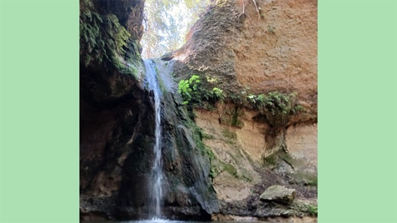 Σε ένα σημείο, το τοπίο πραγματικά μας μάγεψε. Η δεξιά ορθοπλαγιά, της οποίας το πάνω μέρος εξέχει αρκετά, δημιουργεί ένα κοίλωμα κατάφυτο από μικρά πράσινα φυτά. Σταγόνες νερού πέφτουν παντού σαν βροχή. Πλησιάζοντας βλέπουμε, ότι οι σταγόνες πέφτουν αφού περάσουν μέσα από αναρίθμητους μικρούς σταλακτίτες. Το στενό φαράγγι με την καταπράσινη πλαγιά και ο ήχος από τις σταγόνες του νερού που πέφτουν, δημιουργούν ένα πανέμορφο και υποβλητικό τοπίο.