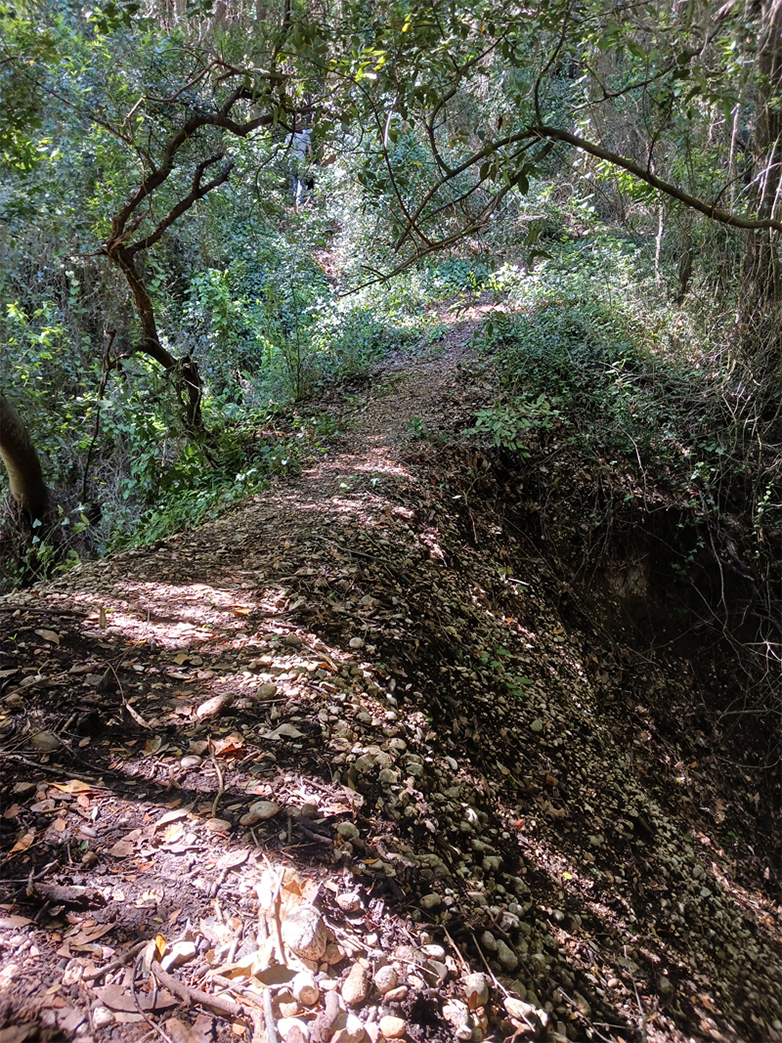 Το τοπίο δεν διαφέρει από ανάλογα μέρη σε κοίτες ποταμών, αυτή την εποχή. Πυκνή καταπράσινη βλάστηση, όπου κυριαρχούν τα πλατάνια, πλαισιώνει την χαλικόστρωτη κοίτη. Σε πολλά σημεία, υπάρχουν μεγάλα βράχια και συσσωρευμένα ξερά ξύλα που κατεβάζει το ρέμα. Αρχίζουμε να ανηφορίζουμε κόντρα στο ρεύμα του ποταμού. Ένα μεγάλο δέντρο δάφνης μας ξαφνιάζει ευχάριστα. Η διαδρομή είναι αρκετά εύκολη, αν και σε αρκετές περιπτώσεις αναγκαζόμαστε να περπατάμε μέσα στα νερά του ποταμού ή να σκαρφαλώνουμε για να περάσουμε βράχια ή πεσμένους κορμούς. Μετά από 10 λεπτά περπάτημα περίπου, παρατηρούμε ,πως οι όχθες του ποταμού γίνονται ολοένα πιό ψηλές και πιό απότομες. Σταδιακά, η κοίτη μετατρέπεται σε ένα στενό φαράγγι με ψηλές και απότομες ορθοπλαγιές, που πολλές φορές συγκλίνουν μεταξύ τους.