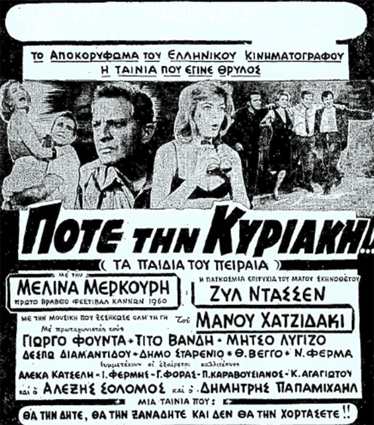 Αλλά και στο σινεμά. Από τον Γιώργο Τζαβέλλα που αποτυπώνει στο πρόσωπο της ηρωίδας του, της Αγνής του λιμανιού, όλη την πίκρα για τη γονική εγκατάλειψη που την οδήγησε στην Τρούμπα έως τον σκηνοθέτη Βασίλη Γεωργιάδη, που φέρνει τα «Κόκκινα φανάρια» του στην Ακαδημία Κινηματογράφου, ως υποψήφια για το Όσκαρ ξενόγλωσσης ταινίας, αλλά και τον Μάνο Χατζηδάκι, που κερδίζει το χρυσό αγαλματίδιο για τη μουσική επένδυση της ταινίας «Ποτέ την Κυριακή», με σκηνοθέτη τον Ζιλ Ντασέν και τη Μελίνα Μερκούρη στον ρόλο της πόρνης του πειραϊκού λιμανιού. Η πρωταγωνίστρια θα βραβευθεί για την ερμηνεία της με το βραβείο α΄ γυναικείου ρόλου στο Φεστιβάλ των Καννών.
