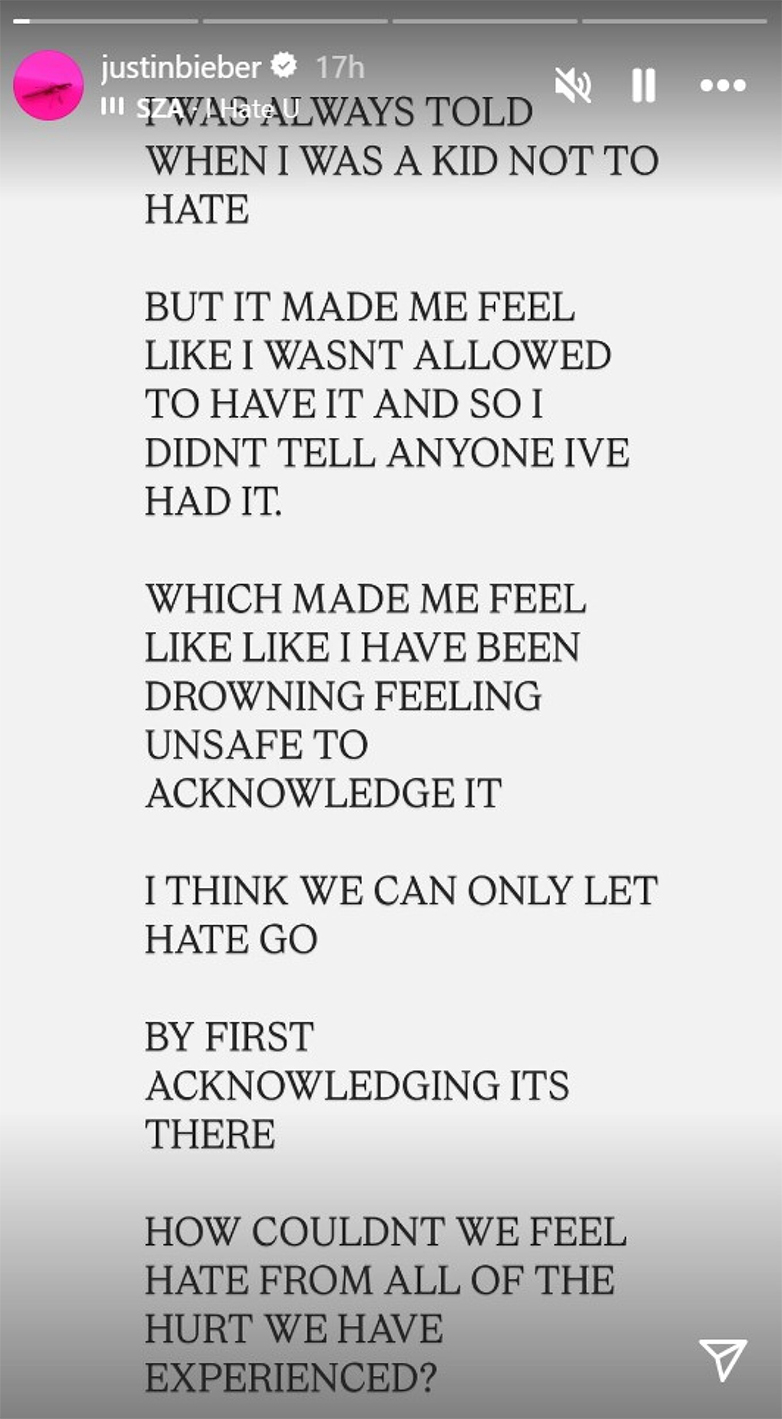 Ο διάσημος τραγουδιστής μοιράστηκε στα Instagram Stories ένα κείμενο σε γκρι φόντο γράφοντας για τη δυσκολία στη διαχείριση των συναισθημάτων του. Σε συνδυασμό με το μελαγχολικό ήχο του τραγουδιού της SZA «I Hate U» που επέλεξε να ακούγεται, πυροδότησε νέες ανησυχίες για την ψυχική του υγεία.