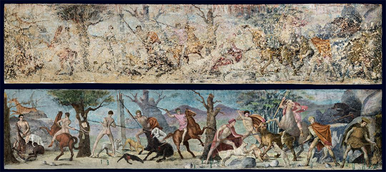 Αρχαιολογικός χώρος των Αιγών. Πρόσοψη Τάφου Φιλίππου Β’. Η τοιχογραφία με το κυνήγι (Φωτ. Χρίστος Σιμάτος).