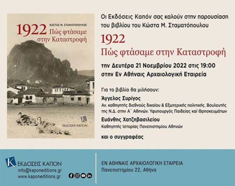 Οι εκδόσεις Καπόν παρουσιάζουν το βιβλίο «1922. Πώς φτάσαμε στην Καταστροφή» του Κώστα Σταματόπουλου, τη Δευτέρα 21 Νοεμβρίου και ώρα 19:00 στην Εν Αθήναις Αρχαιολογική Εταιρεία.