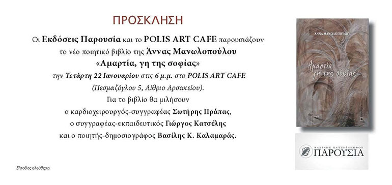 Παρουσιάζεται η νέα ποιητική σύνθεση της Άννας Μανωλοπούλου «Αμαρτία, Γη της Σοφίας». Πρόκειται για μία ποιητική σύνθεση με θεατρική δομή, όπου η Αμαρτία, του πειρασμού το κάλεσμα στου στοχασμού την υπέρβαση, ανοίγει δρόμο στης ζωής τον μύθο με την Αγάπη, διαθήκης δωρεά, αρχέτυπο της ύπαρξής μας.