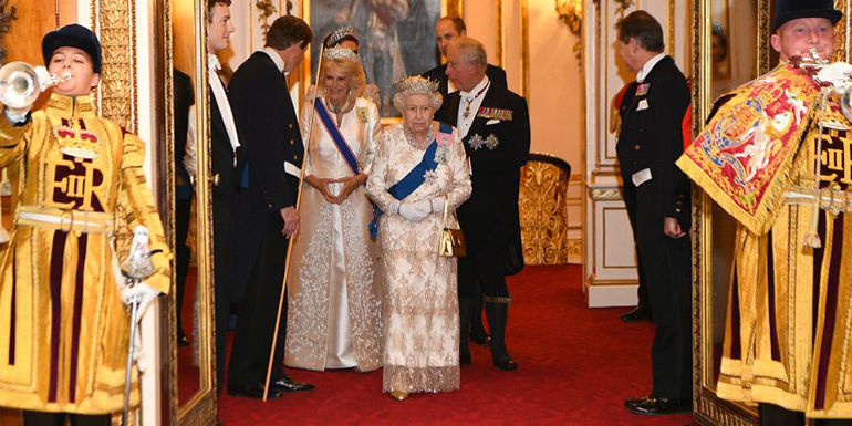 Η βασίλισσα Ελισάβετ που φορούσε λευκό φόρεμα με χρυσά στοιχεία της Βρετανίδας σχεδιάστριας Άντζελα Κέλι, συνοδευόταν από τον πρίγκιπα Κάρολο και τον πρωτότοκο γιο του, πρίγκιπα Ουίλιαμ. Δίπλα τους ήταν οι σύζυγοί τους: οι δούκισσες της Κορνουάλης Καμίλα και του Κέμπριτζ Κέιτ. Η Καμίλα φορούσε ένα λευκό μακρύ φόρεμα του σχεδιαστή Μπρους Όλντφιλντ και το διάδημα Greville που κάποτε φορούσε η βασιλομήτωρ – η μητέρα της Ελισάβετ Β’. Η Κέιτ επέλεξε ένα λευκό φόρεμα με ασημένιες λεπτομέρειες της σχεδιάστριας Τζένι Πάκαμ και την τιάρα Cambridge Lover’s Knot που φέρει μαργαριτάρια και διαμάντια, την οποία κάποτε φορούσε η αείμνηστη Λαίδη Νταϊάνα, η μητέρα του Ουίλιαμ.