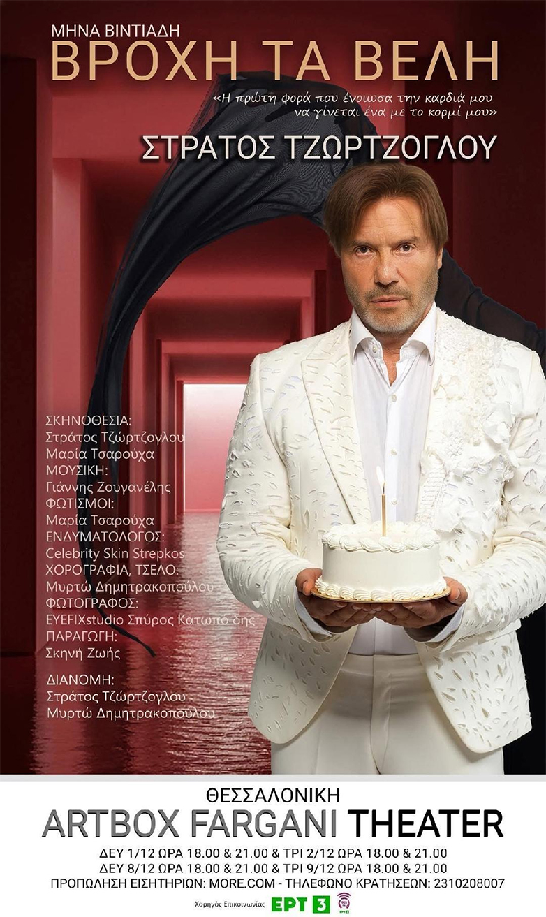 Ο Στράτος Τζώρτζογλου πρωταγωνιστεί στο έργο «Βροχή τα Βέλη» του Μηνά Βιντιάδη, το οποίο παρουσιάζεται στο Θέατρο Artbox Fargani στη Θεσσαλονίκη.
