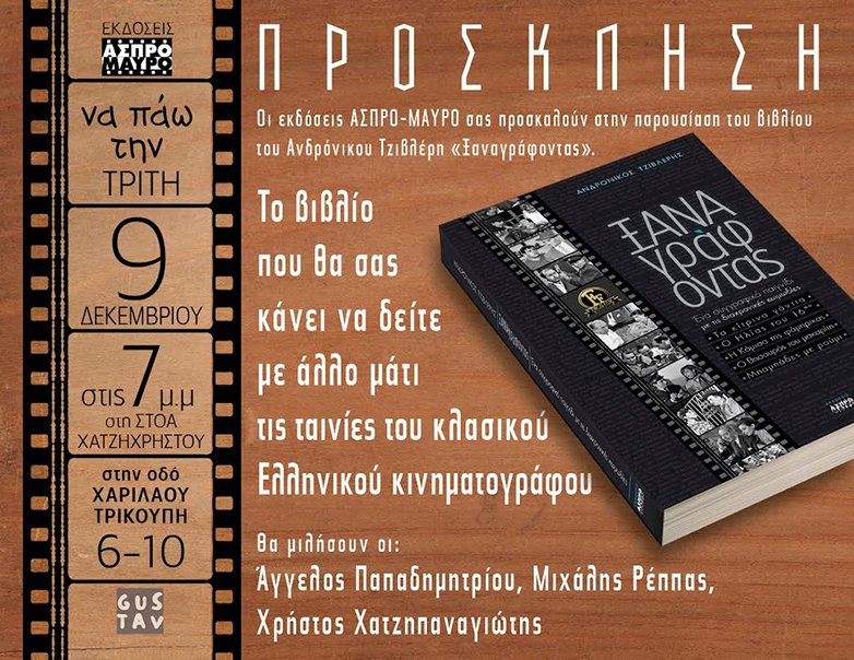 Την Τρίτη 9 Δεκεμβρίου στις 19.00 στο καφέ Gustav, στη στοά Χατζηχρήστου (Χαρ. Τρικούπη 6 -10) θα γίνει η παρουσίαση του βιβλίου του Ανδρόνικου Τζιβλέρη «Ξαναγράφοντας. Ένα συγγραφικό παιγνίδι με τις αθάνατες κωμωδίες».