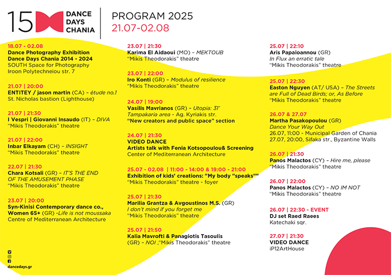 *Επισκεφθείτε την ιστοσελίδα μας https://dancedays.gr/festival/ για το αναλυτικό πρόγραμμα και πληροφορίες.