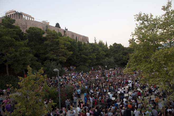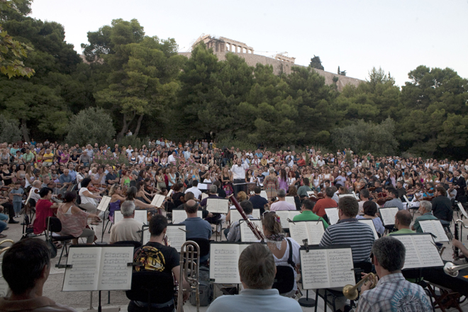 Δεν ήταν ένα συνηθισμένο απόγευμα για το κέντρο της Αθήνας. Αποκλεισμένοι δρόμοι, κλειστοί σταθμοί του ΜΕΤΡΟ, μια πορεία σε εξέλιξη… Κι όμως! Σε πείσμα των δεδομένων περίπου δύο χιλιάδες Αθηναίοι, αλλά και πολλοί τουρίστες έφθασαν στη Διονυσίου Αρεοπαγίτου, το απόγευμα της Πέμπτης 18 Ιουλίου για την ανοιχτή πρόβα της Ορχήστρας της Εθνικής Λυρικής Σκηνής.