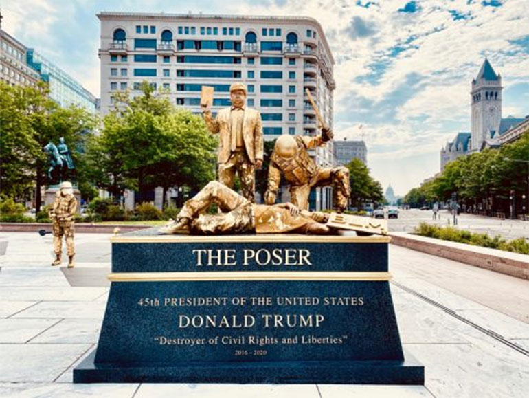 Πριν λίγες μέρες, καλλιτέχνες δρόμου, βαμμένοι με μεταλλική χρυσή μπογιά από την κορυφή μέχρι τα νύχια, πόζαραν ως αγάλματα πάνω σε βάθρα σε τρία σημεία στην Ουάσινγκτον, χαιρετίζοντας τον 45ο Πρόεδρο των ΗΠΑ ως τον «καταστροφέα των δικαιωμάτων και ελευθεριών των πολιτών».