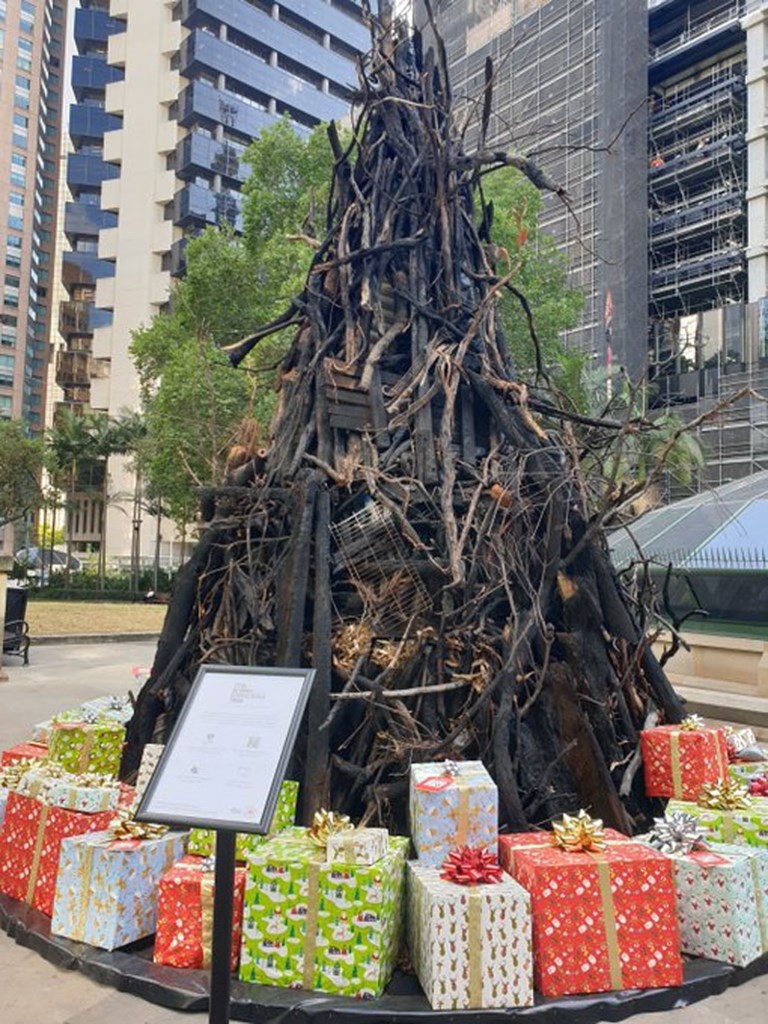 Ένα χριστουγεννιάτικο δέντρο φτιαγμένο από καρβουνιασμένα κλαδιά και άλλα απομεινάρια από τις πυρκαγιές στην Αυστραλία στήθηκε στην κεντρική επιχειρηματική συνοικία του Σίδνεϊ σε μια οδυνηρή υπενθύμιση των φονικών πυρκαγιών που έχουν καταστρέψει ένα μεγάλο μέρος της Αυστραλίας.
