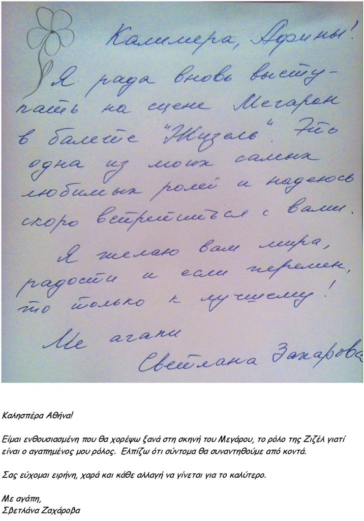 Την έχουν χαρακτηρίσει «ζωντανό θρύλο», «ντίβα», «σούπερσταρ», ενώ το Θέατρο Μπολσόι της έχει απονείμει τον τίτλο «Ζαχάροβα – η απόλυτη μπαλαρίνα» (prima assoluta ballerina of Bolshoi Theatre) παραλείποντας το μικρό της όνομα, όπως είχε συμβεί παλαιότερα με δύο θρυλικές μπαλαρίνες, την Πάβλοβα και την Ουλάνοβα. Η Σβετλάνα Ζαχάροβα, η πιο περιζήτητη χορεύτρια του κόσμου σήμερα, η «Καλλιτέχνις του λαού της Ρωσίας», επέλεξε να εμφανιστεί στην Ελλάδα, αυτά τα Χριστούγεννα, αν και αποτελεί «το μήλον της έριδος» ανάμεσα στις μεγαλύτερες σκηνές παγκοσμίως –από τη Σκάλα του Μιλάνου και την Όπερα του Παρισιού έως το New York City Ballet και τα Μπαλέτα του Τόκιο– που τη διεκδικούν συχνά ως προσκεκλημένη μπαλαρίνα τους για τις εορταστικές παραστάσεις τους.