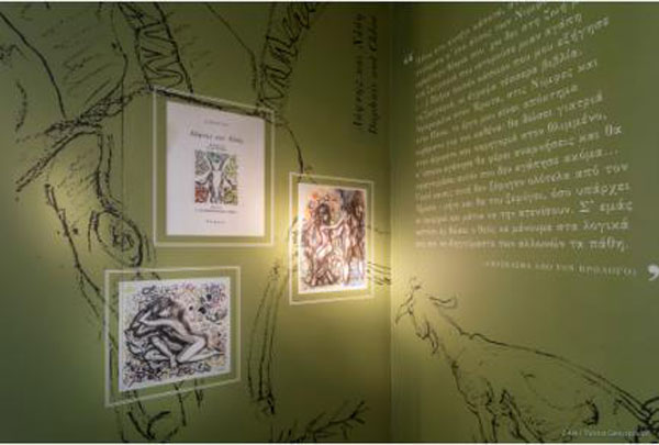 Η έκθεση στο αεροδρόμιο επικεντρώνεται σε έξι από τις εικονογραφημένες εκδόσεις του καλλιτέχνη: Το λεύκωμα Λυρικά, το λεύκωμα Ινδία, τα Ποιήματα του Κ. Π. Καβάφη, το Δάφνης και Χλόη του Λόγγου, τη Λυσιστράτη του Αριστοφάνη και την Οδύσεια του Νίκου Καζαντζάκη.