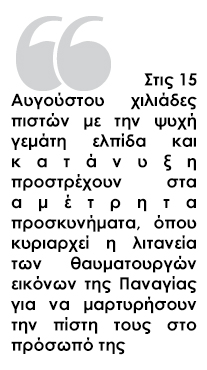 Στις 15 Αυγούστου χιλιάδες πιστών με την ψυχή γεμάτη ελπίδα και κατάνυξη προστρέχουν στα αμέτρητα προσκυνήματα, όπου κυριαρχεί η λιτανεία των θαυματουργών εικόνων της Παναγίας για να μαρτυρήσουν την πίστη τους στο πρόσωπό της. Η Παναγία, το ιερότερο από τα πρόσωπα της Ορθοδοξίας, δοξάζεται σε κάθε γωνιά της Ελλάδας. Η λατρεία που έχουν οι πιστοί στη «μητέρα» του Θεού και των ανθρώπων αποδεικνύεται από τα πολλά ονόματα: Μεγαλόχαρη, Εκατονταπυλιανή, Φανερωμένη, Κοσμοσωτήρα, Χοζοβιώτισσα, Εικοσιφοίνισσα, Βρεφοκρατούσα, Ελεούσα, Θαλασσινή, Γιάτρισσα, Μυρτιδιώτισσα και πολλά ακόμη.