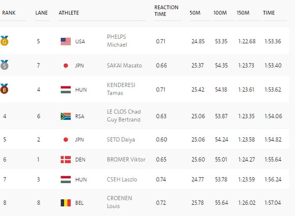 Πίσω από τον Φελπς με διαφορά τεσσάρων εκατοστών του δευτερολέπτου ήταν ο Ιάπωνας Μασάτο Σακάι και τρίτος ο Ούγγρος Τάμας Κεντερέσι.