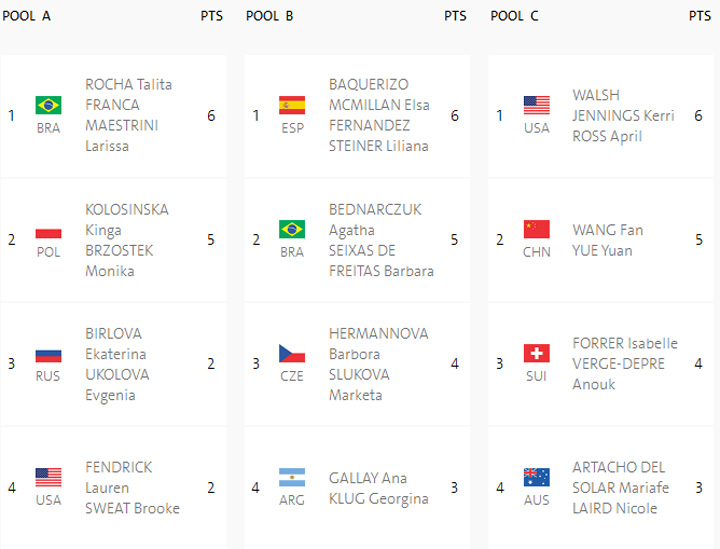 Στις γυναίκες η Βραζιλία πήρε τη νίκη απέναντι στην Πολωνία για τον α’ όμιλο. Οι Φράνκα Μαεστρίνι και Ρότσα επικράτησαν 21-10 και 21-15 απέναντι στις Κολόσινσκα και Μπρζόστεκ.