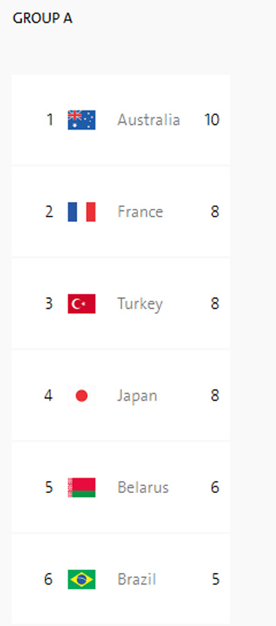 Με τρεις αναμετρήσεις ολοκληρώθηκε η δράση στον Α’ όμιλο του μπάσκετ των γυναικών. Η Αυστραλία που πήρε την πρώτη θέση με πέντε νίκες επικράτησε με σκορ 74-66 της Λευκορωσίας, η Ιαπωνία κατάφερε να νικήσει τη Γαλλία με 79-71, ενώ σε ματς που κρίθηκε στην παράταση η Βραζιλία έχασε με 79-76 από την Τουρκία.