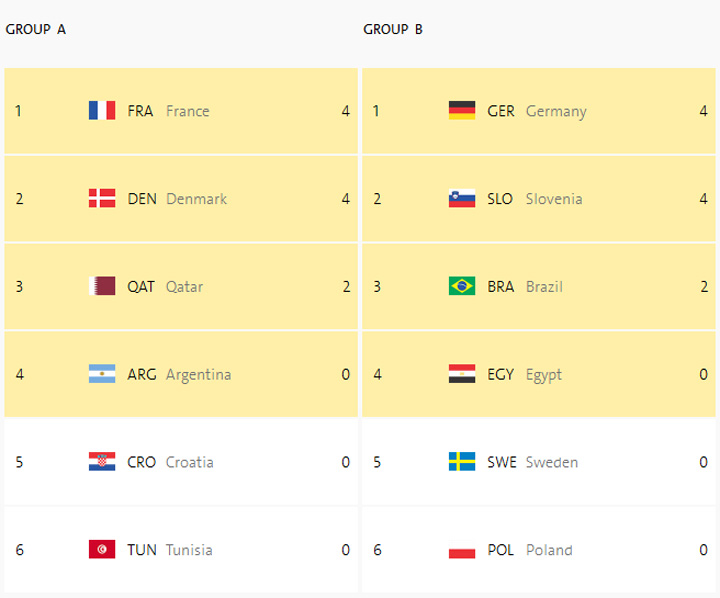 Νωρίτερα για τον δεύτερο όμιλο η Γερμανία πέτυχε δεύτερη νίκη επικρατώντας 32-29 της Πολωνία. Για τον πρώτο όμιλο, η πρωτοπόρος Γαλλία επικράτησε άνετα 35-20 του Κατάρ, ενώ αήττητη παρέμεινε και η Δανία μετά τη νίκη με 31-23 επί της Τυνησίας.