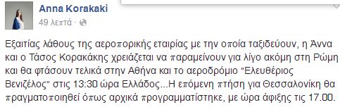 Ύστερα από αρκετή ώρα καθυστέρηση η αστυνομία της Ιταλίας κατάλαβε το λάθος της και άφησε ελεύθερους την Αννα Κορακάκη και τον πατέρα της επιτρέποντας στην ελληνική αποστολή να αποχωρήσει. Σύμφωνα με την ίδια, το λάθος είναι της εταιρίας Alitalia, που δεν ενημέρωσε επαρκώς τις Αρχές του αεροδρομίου, ενώ ίδια είναι η άποψη και των υπεύθυνων του αεροδρομίου Φιουμιτσίνο με τους οποίους επικοινώνησε το zougla.gr.