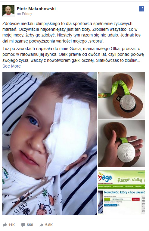 Κίνηση ανθρωπιάς από τον αργυρό Ολυμπιονίκη Πιορτ Μαλακόφσκι, ο οποίος αποφάσισε να θέσει προς πώληση το μετάλλιο που κατέκτησε στους Αγώνες του Ρίο για να συγκεντρωθούν χρήματα για ένα αγόρι που πάσχει από καρκίνο.