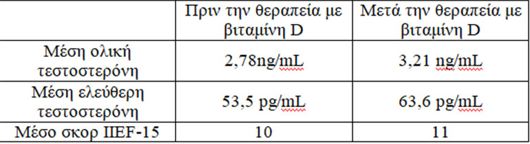 Στην υποομάδα των 41 ανδρών που έκαναν θεραπεία με βιταμίνη D παρατηρήθηκε αύξηση στα επίπεδα ολικής και ελεύθερης τεστοστερόνης και καλύτερη στυτική λειτουργία.