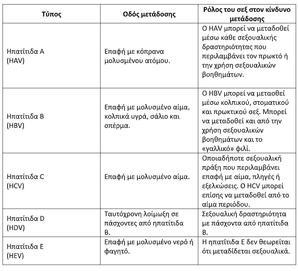 Η ηπατίτιδα ιογενούς προέλευσης συνήθως προκαλείται από έναν από τους ιούς A, B, C, D ή Ε. Η πλειοψηφία αυτών των ιών μπορεί να μεταδοθεί σεξουαλικά όπως φαίνεται στον παρακάτω πίνακα: