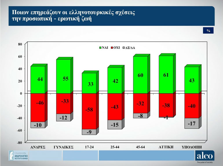 Στο δεύτερο ερώτημα «κατά πόσο επηρεάζει η σύγκρουση στο Αιγαίο και η επιθετικότητα της Τουρκίας την προσωπική σας ζωή;», το θερμόμετρο των αισθημάτων και των ερώτων ανέβαινε, όσο «δεξιόστροφα» ψήφιζαν οι πολίτες.