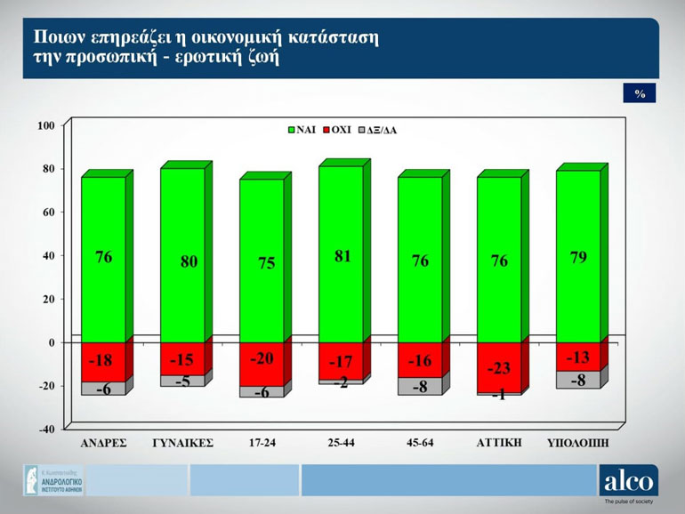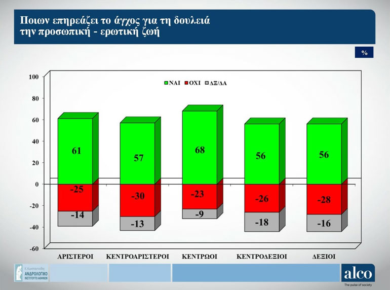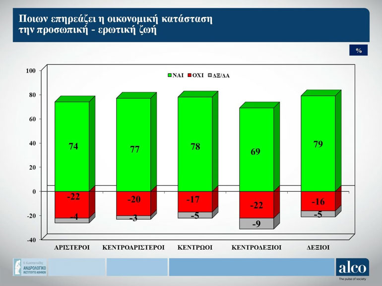 Μια πρώτη διαπίστωση είναι ότι, ανεξάρτητα από τα πολιτικά πιστεύω, η οικονομική και πολιτική κατάσταση επηρεάζει την ερωτική και τη συναισθηματική ζωή των πολιτών το ίδιο. Αριστεροί και δεξιοί ένιωσαν αναταράξεις λόγω της κρίσης και της οικονομικής ανασφάλειας που βιώνει η χώρα στον ίδιο βαθμό.