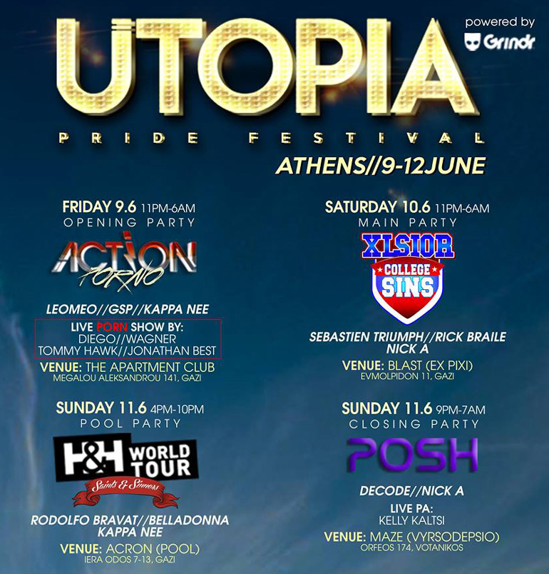 Το Σάββατο 10 Ιουνίου, μετά τη μεγάλη παρέλαση και τη γιορτή στο Σύνταγμα, την σκυτάλη παίρνει το main party του UTOPIA, το XLSIOR (με θέμα College Sins), σ’ έναν από τους ομορφότερους χώρους στην Αθήνα, το CLUB Blast (ex PIXI) Ευμολπιδών 11 στο Γκάζι. DJs της βραδιάς θα είναι οι Sebastien Triumph (France) Rick Braile (France) Nick A (Greece).