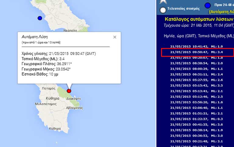 Ασθενής σεισμική δόνηση μεγέθους 3,4 βαθμών της κλίμακας Ρίχτερ σημειώθηκε στις 12.50 το μεσημέρι της Πέμπτης στον θαλάσσιο χώρο βόρειο – βορειοανατολικά των Κυθήρων.