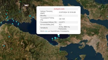 Διπλή σεισμική δόνηση μεγέθους 3,4 και 3,3 βαθμών της Κλίμακας Ρίχτερ σημειώθηκε λίγο πριν τις 22:30 το βράδυ της Δευτέρας (1/7) στην Περαχώρα Κορινθίας.
