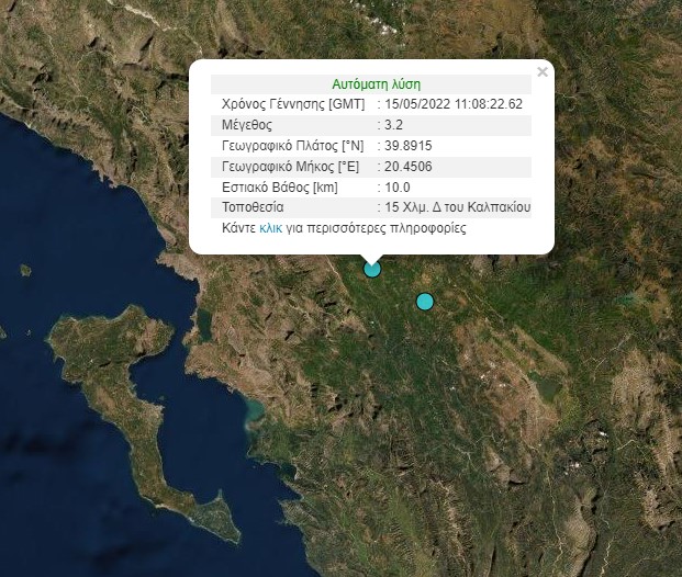 Διπλός σεισμός μεγέθους 3,2 Ρίχτερ σημειώθηκε το μεσημέρι της Κυριακής στο Καλπάκι Ιωαννίνων, με διαφορά ενός λεπτού.