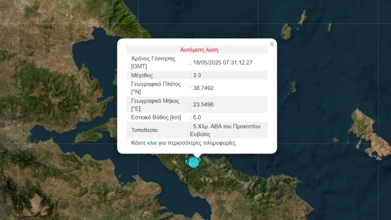 Η δόνηση είχε επίκεντρο 5 Χλμ. Ανατολικά Βορειοανατολικά από το Προκόπι Ευβοίας και εστιακό βάθος 5 χιλιόμετρα.
