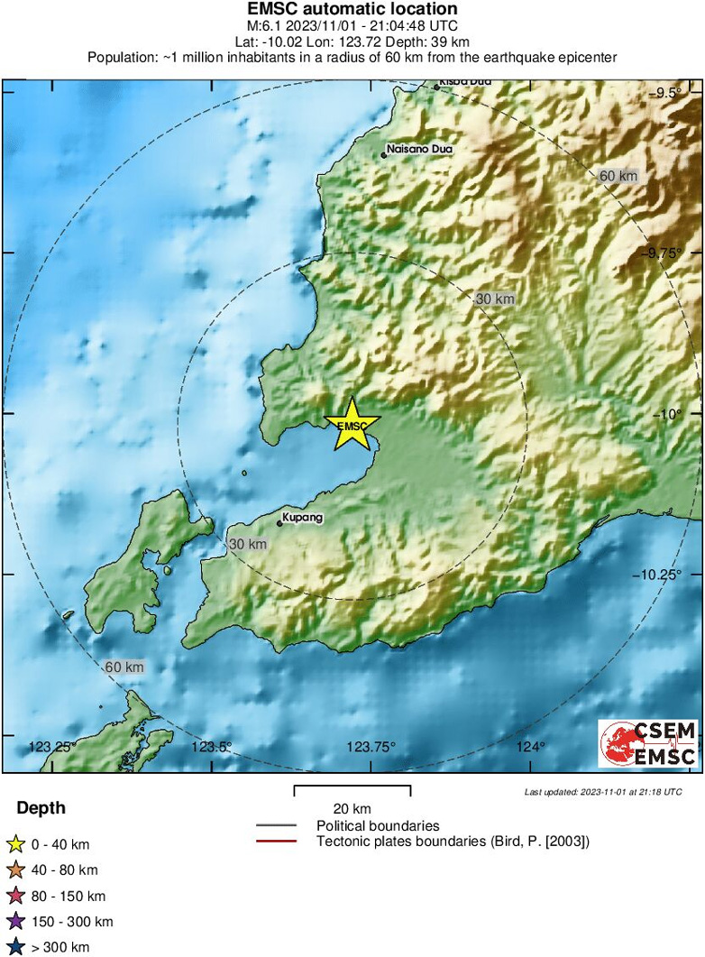Το επίκεντρο εντοπίζεται 21 χιλιόμετρα βορειοανατολικά της πόλης Κουπάνγκ του νησιού και το εστιακό βάθος υπολογίζεται σε 28 χιλιόμετρα.