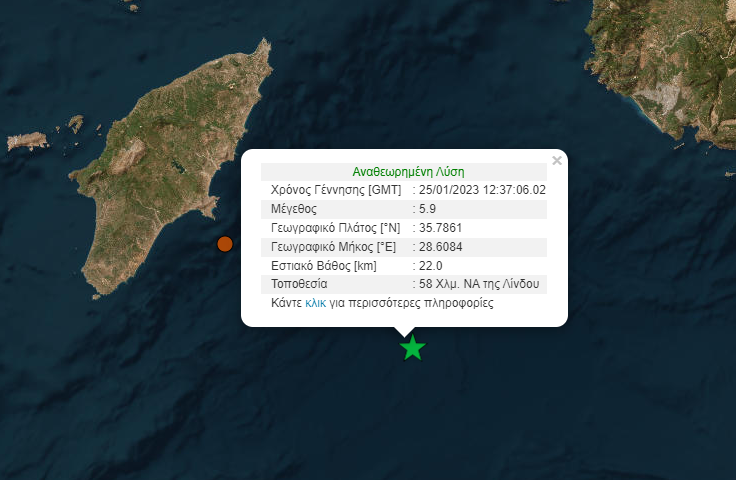 Σύμφωνα με το Γεωδυναμικό Ινστιτούτο ο σεισμός είχε επίκεντρο τη θαλάσσια περιοχή 58 χιλιόμετρα νοτιοανατολικά της Λίνδου και εστιακό βάθος 22 χλμ.