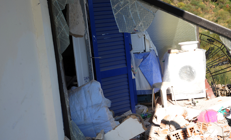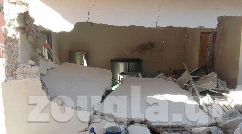 Όπως φαίνεται στα πλάνα, ο βράχος που αποκολλήθηκε από τη σεισμική δόνηση και κατρακυλώντας από την πλαγιά έφτασε έως το σπίτι άνοιξε μια ολόκληρη τρύπα σε έναν από τους τοίχους του κτίσματος.
