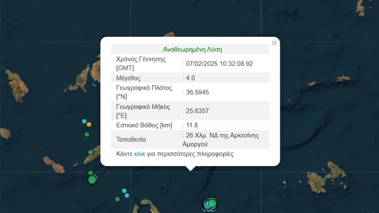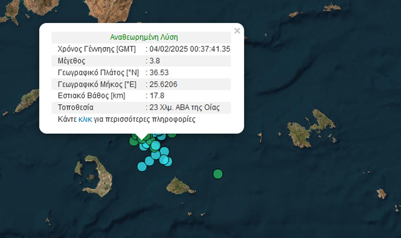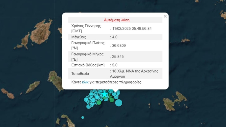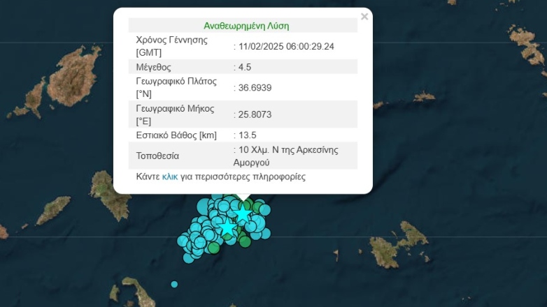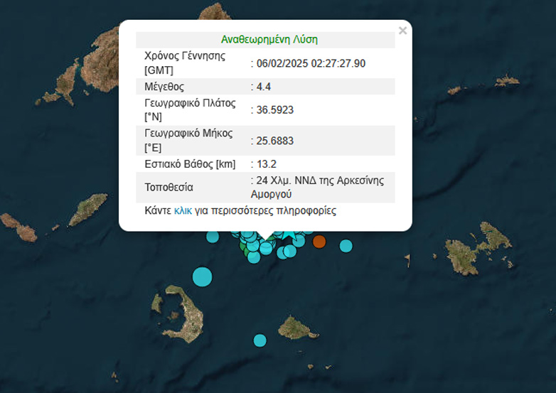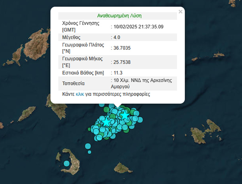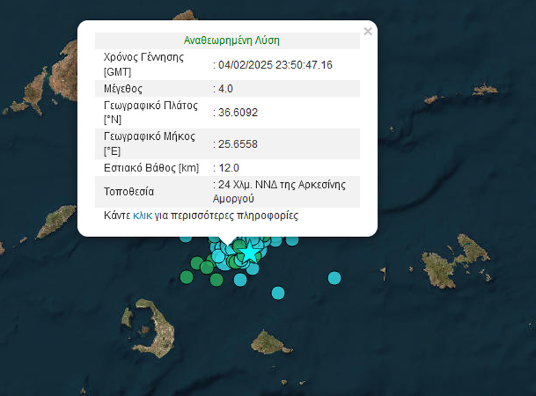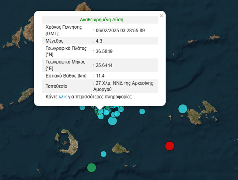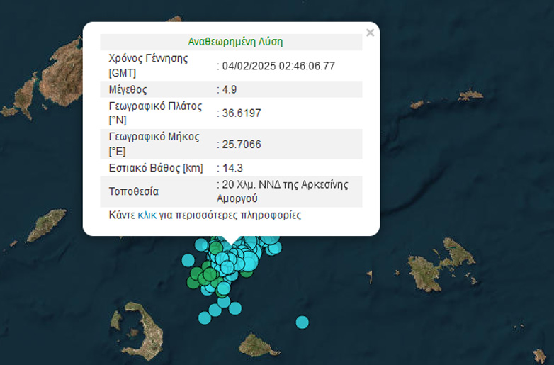 Στις 09:19 πμ. της Τρίτης (4/2) σημειώθηκε νέος σεισμός μεγέθους 3,7 βαθμών της κλίμακας Ρίχτερ, 23 χιλιόμετρα νοτιοδυτικά της Αρκεσίνης Αμοργού, με εστιακό βάθος 5 χιλιόμετρα