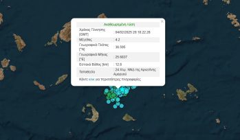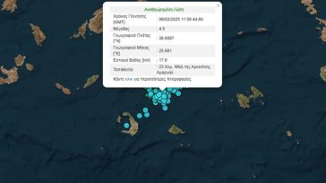 Στις 15:44 μ.μ. πραγματοποιήθηκε σεισμός μεγέθους 3,7 Ρίχτερ, 25 χιλιόμετρα νοτιοδυτικά της Αρκεσίνης Αμοργού, με εστιακό βάθος 14,2 χιλιόμετρα.