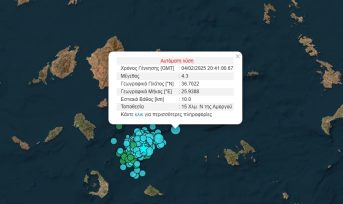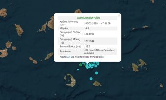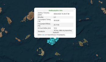 Στις 08:09 το πρωί της Τρίτης (4/2) καταγράφηκε νέα ισχυρή σεισμική δόνηση μεγέθους 4,8 βαθμών της κλίμακας Ρίχτερ, 19 χιλιόμετρα νoτιοδυτικά της Αρκεσίνης Αμοργού με εστιακό βάθος στα 13,5 χιλιόμετρα.