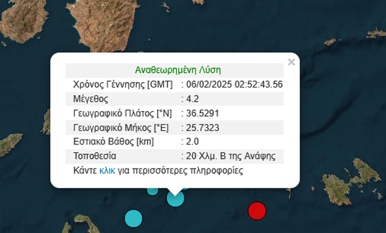 Στις 08:48 πμ. της Τρίτης (4/2) σημειώθηκε νέος σεισμός μεγέθους 3,2 βαθμών της κλίμακας Ρίχτερ, 15 χιλιόμετρα βορειοδυτικά της Ανάφης, με εστιακό βάθος 5 χιλιόμετρα.