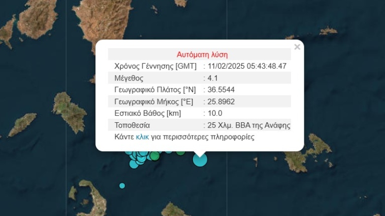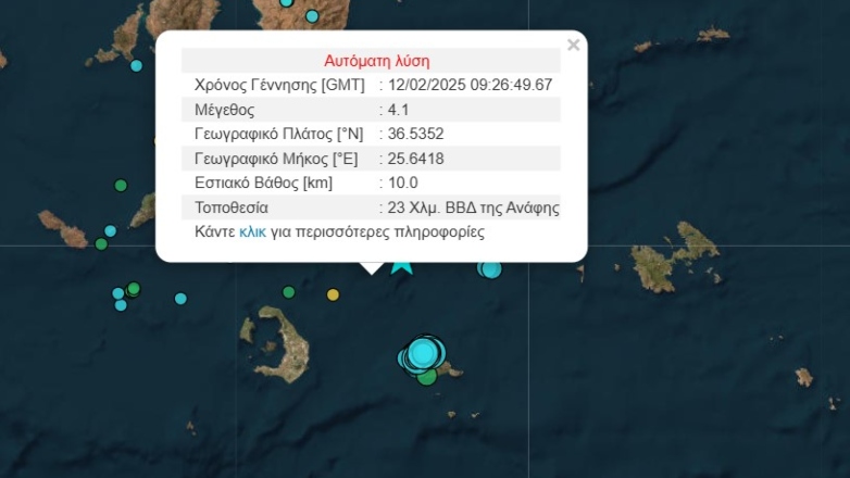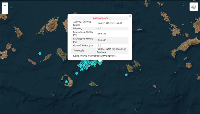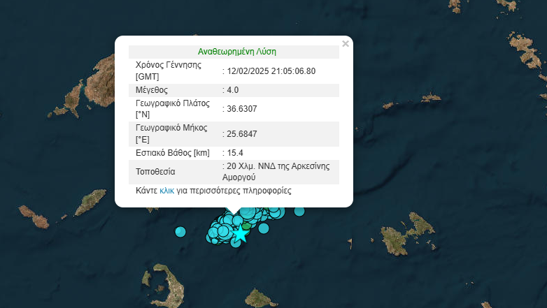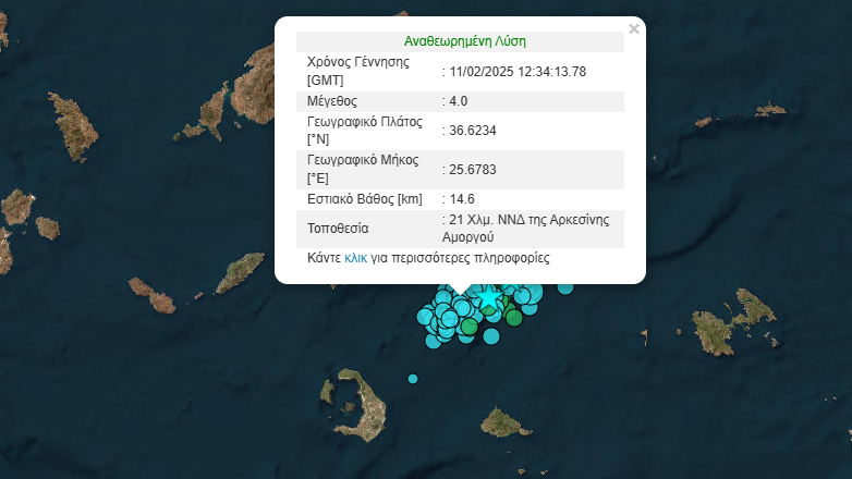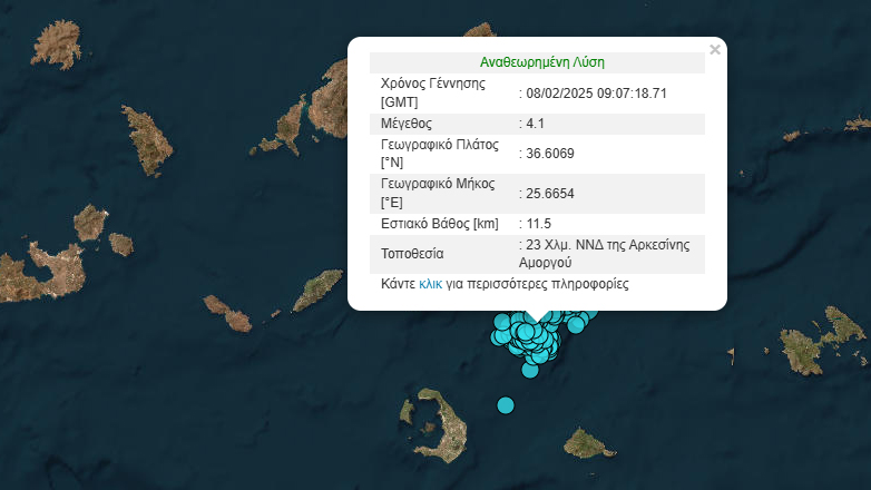 Σεισμός 4,1 Ρίχτερ, έγινε στις 11:42 της Τετάρτης (19/02) με επίκεντρο 18 Χλμ. ΝΔ της Αρκεσίνης Αμοργού και εστιακό βάθος 10 χιλιόμετρα.