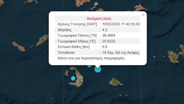Σεισμός 3,1 Ρίχτερ σημειώθηκε το μεσημέρι της Τρίτης (25/2) στις 14:26 με επίκεντρο 35 Χλμ. Ν της Ανάφης και εστιακό βάθος 5,8 χιλιόμετρα