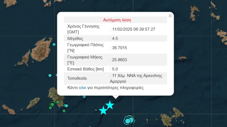 Το επίκεντρο της δόνησης εντοπίζεται στον θαλάσσιο χώρο 18 χλμ. ΝΝΔ της Αρκεσίνης Αμοργού.