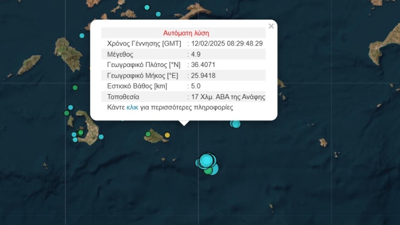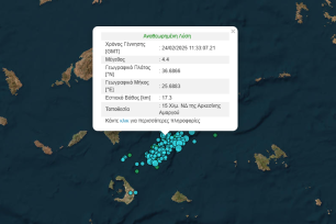 Σεισμός 4,4 Ρίχτερ, σημειώθηκε στις 13.33 την Δευτέρα (24/2), με επίκεντρο : 15 Χλμ. ΝΔ της Αρκεσίνης Αμοργού και εστιακό βάθος 17,39 χιλιόμετρα