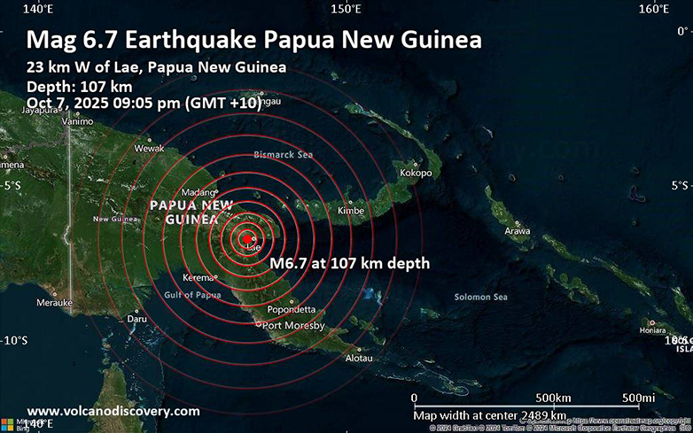 Ένας πολύ ισχυρός σεισμός μεγέθους 6,7 Ρίχτερ έπληξε την περιοχή Lae , στην επαρχία Morobe, στην Παπούα Νέα Γουινέα , πριν λίγη ώρα ( βράδυ της Τρίτης 7 Οκτωβρίου 2025, στις 9:05 μ.μ. τοπική ώρα, GMT +10). Ο σεισμός είχε μέτριο βάθος 107 χλμ. και έγινε αισθητός σε μεγάλο βαθμό στην περιοχή.