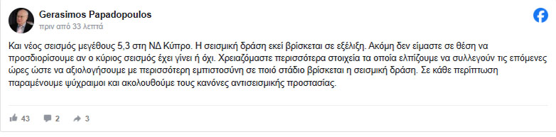 «Και νέος σεισμός μεγέθους 5,3 στη ΝΔ Κύπρο. Η σεισμική δράση εκεί βρίσκεται σε εξέλιξη. Ακόμη δεν είμαστε σε θέση να προσδιορίσουμε αν ο κύριος σεισμός έχει γίνει ή όχι. Χρειαζόμαστε περισσότερα στοιχεία τα οποία ελπίζουμε να συλλεγούν τις επόμενες ώρες ώστε να αξιολογήσουμε με περισσότερη εμπιστοσύνη σε ποιό στάδιο βρίσκεται η σεισμική δράση. Σε κάθε περίπτωση παραμένουμε ψύχραιμοι και ακολουθούμε τους κανόνες αντισεισμικής προστασίας. Η περιοχή έχει αξιόλογο σεισμικό παρελθόν διότι έχουν γίνει σεισμοί με μεγέθη που έφτασαν μέχρι τα 6.6 Ρίχτερ. Είναι μια από τις πιο ενεργές περιοχές του κυπριακού σεισμικού τόξου.»