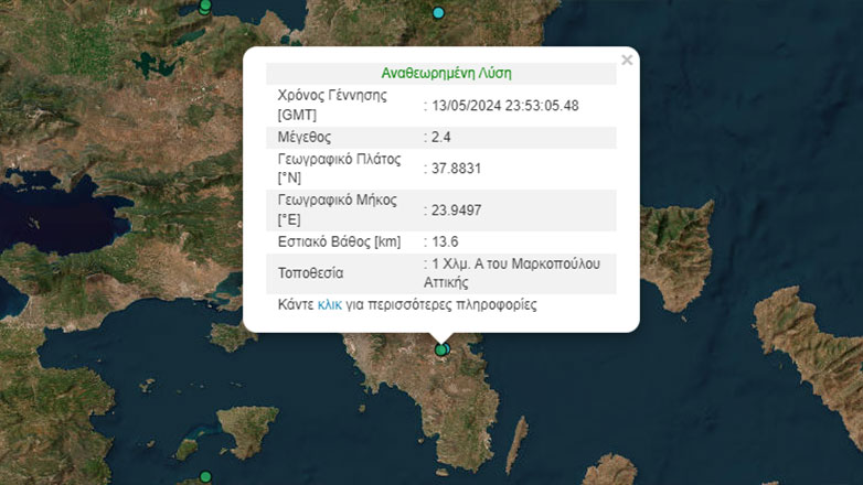 Σεισμός μεγέθους 2,4 βαθμών της Κλίμακας Ρίχτερ σημειώθηκε στις 02:53 τα ξημερώματα της Τρίτης (14/5) στην Αττική.
