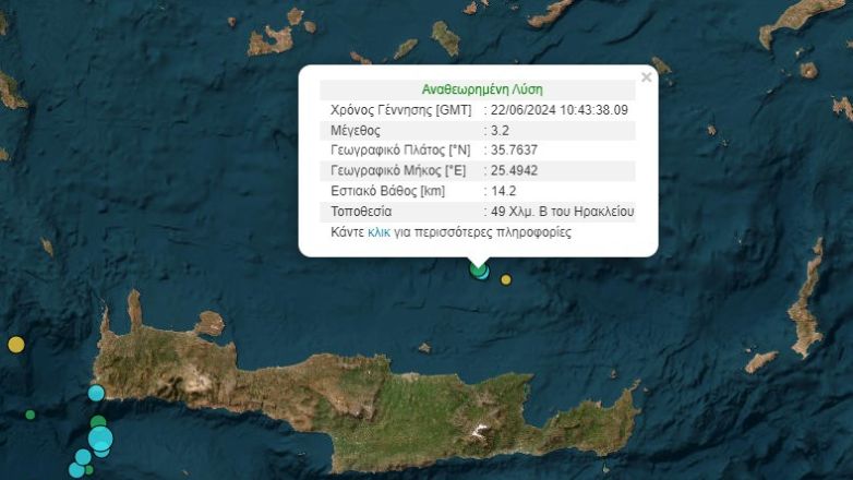 Σεισμική δόνηση μεγέθους 3,2 βαθμών της Κλίμακας Ρίχτερ σημειώθηκε στις 13:43 το μεσημέρι της Κυριακής (22/6) ανοιχτά του Ηρακλείου Κρήτης.