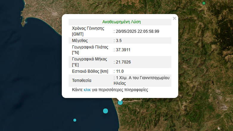 Σεισμός μεγέθους 3,5 βαθμών της κλίμακας Ρίχτερ σημειώθηκε στη 01.05 τα ξημρώματα της Τετάρτης στην Ηλεία.