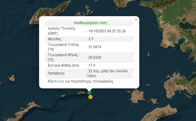 Σεισμική δόνηση μεγέθους 3,7 βαθμών της Κλίμακας Ρίχτερ σημειώθηκε στις 6:25 το πρωί της Πέμπτης (19/10) στη Λέρο.